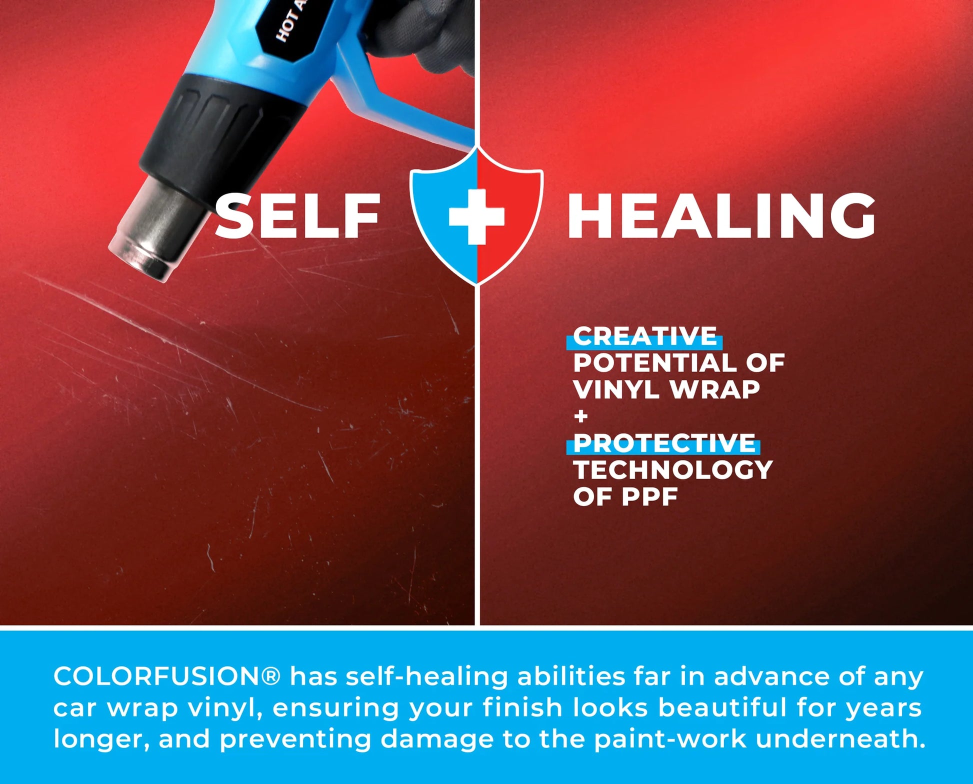 - Exceptional Self-Healing: ColorFusion® has self-healing abilities far in advance of any car wrap vinyl, ensuring your finish looks beautiful 2 x longer than other wraps, and preventing damage to the paint-work underneath. Gently apply heat with a heat gun, and watch your ColorFusion® wrap heal from scratches that would spell the end for any other film.