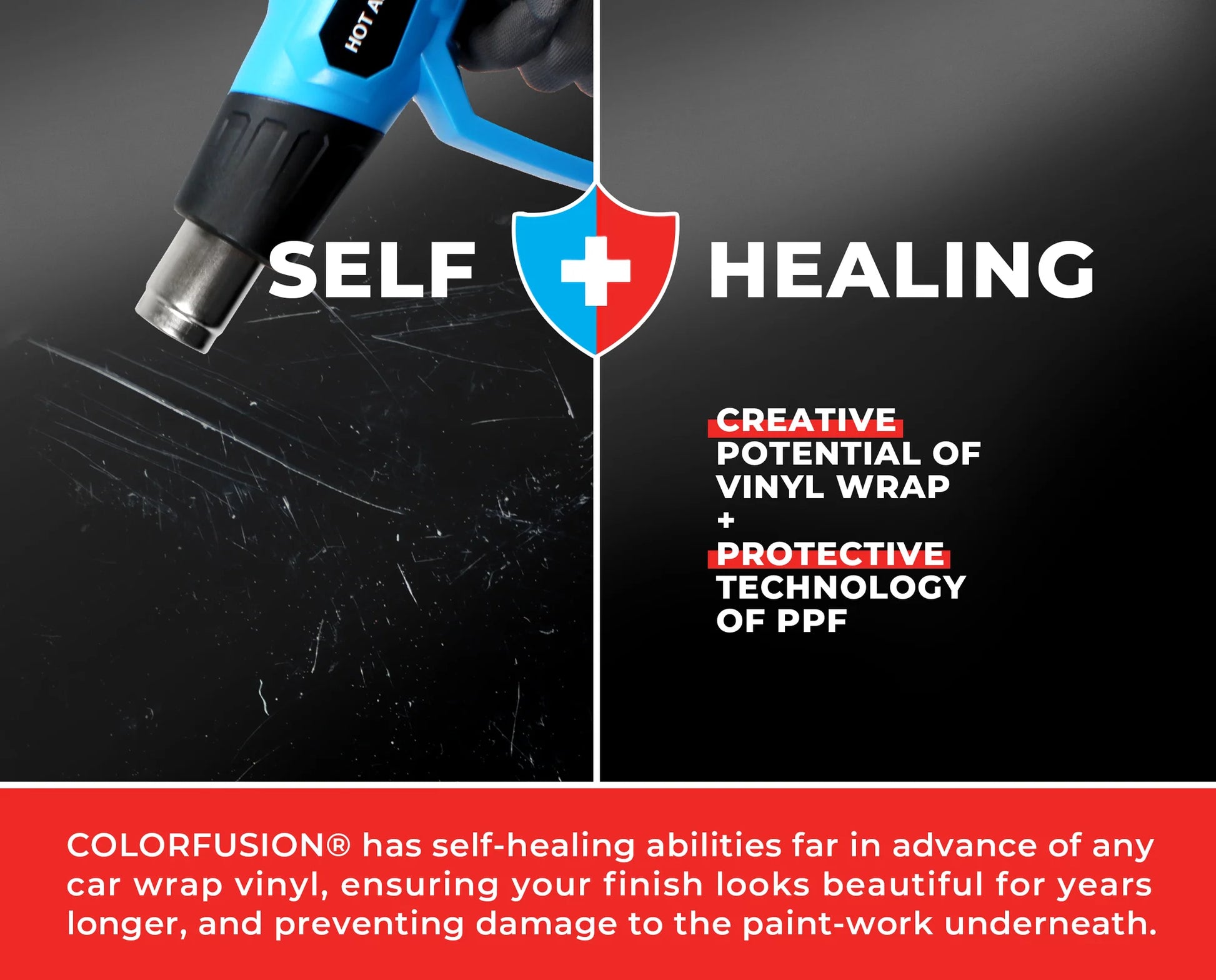 - Exceptional Self-Healing: ColorFusion® has self-healing abilities far in advance of any car wrap vinyl, ensuring your finish looks beautiful 2 x longer than other wraps, and preventing damage to the paint-work underneath. Gently apply heat with a heat gun, and watch your ColorFusion® wrap heal from scratches that would spell the end for any other film.
