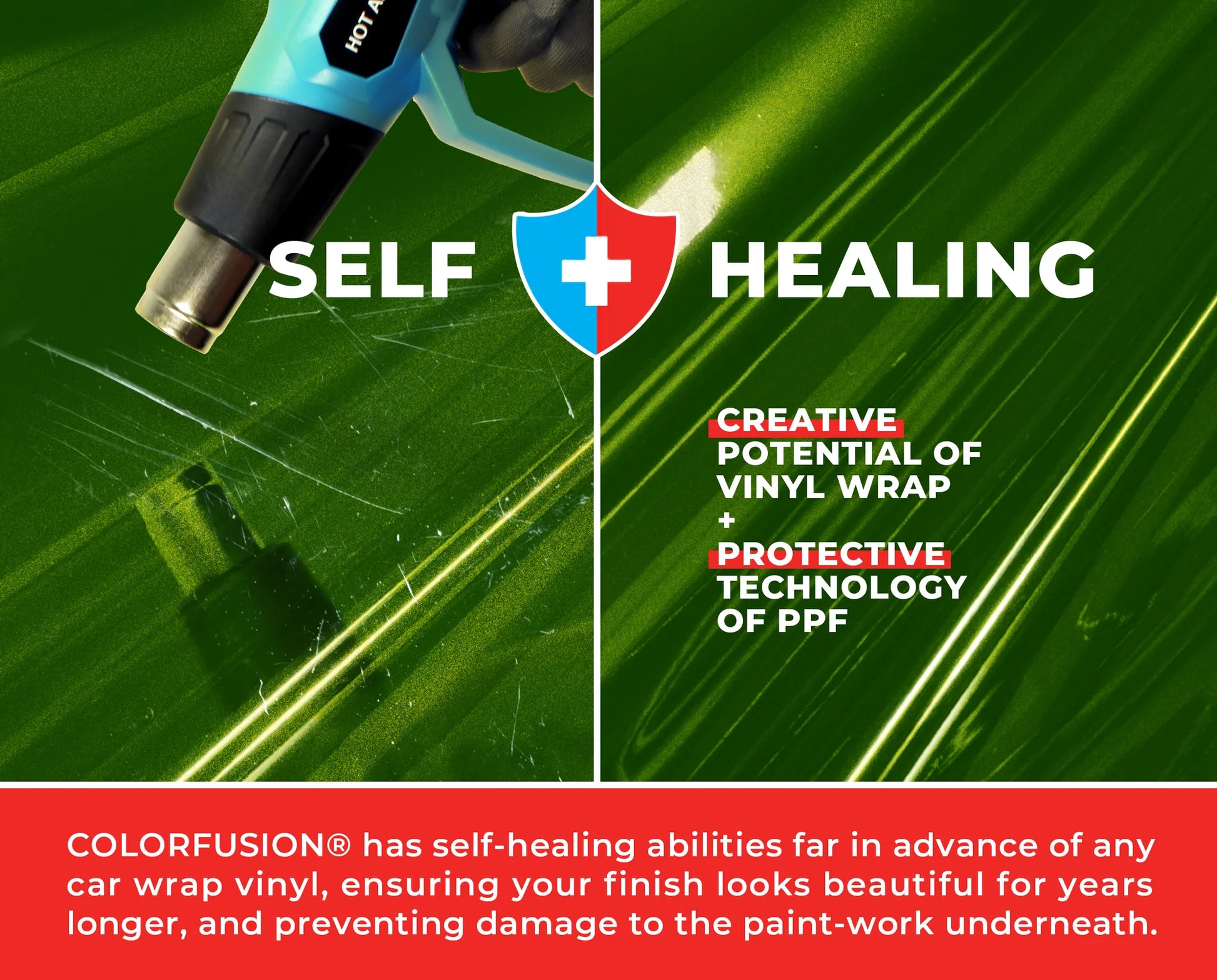 - Exceptional Self-Healing: ColorFusion® has self-healing abilities far in advance of any car wrap vinyl, ensuring your finish looks beautiful 2 x longer than other wraps, and preventing damage to the paint-work underneath. Gently apply heat with a heat gun, and watch your ColorFusion® wrap heal from scratches that would spell the end for any other film.